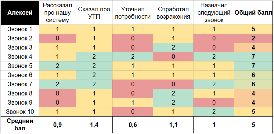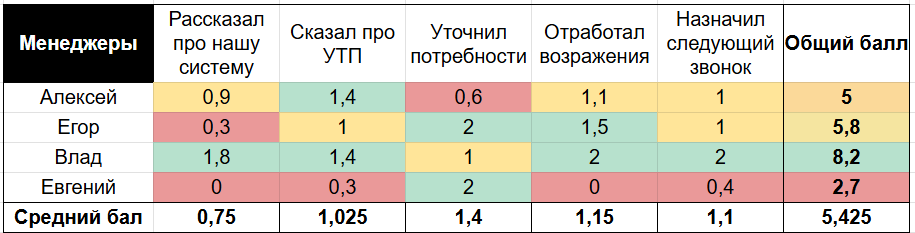 Как видно на условном примере выше, менеджер Евгений проседает по многим пунктам скрипта и имеет самый низкий балл, Алексей и Егор — середнячки, а Влад — абсолютный лидер.